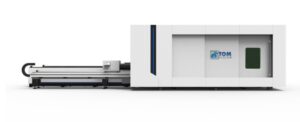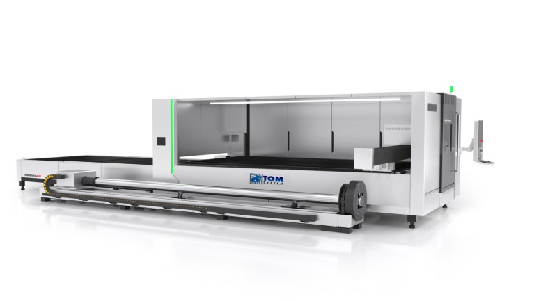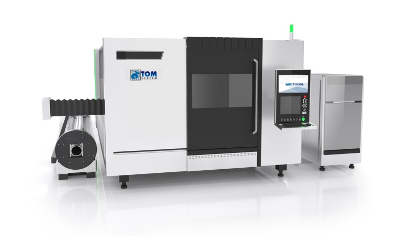 Maszyna CNC do cięcia laserowego o dużej mocy (Fiber Laser) wyposażona w wymienny stół roboczy oraz obrotnicę do cięcia rur i profili.