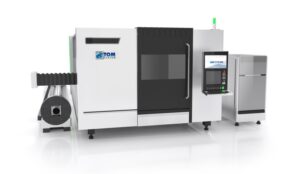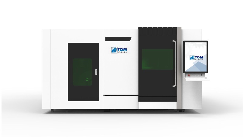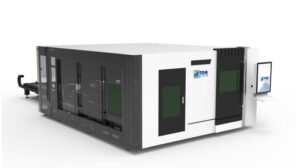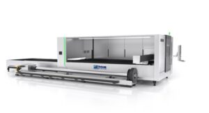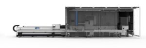 Wycinarka laserowa dużej mocy (światłowodowa) do cięcia materiału ze stali, stali nierdzewnej, aluminium, mosiądzu oraz miedzi. Wyposażona w wymienny stół roboczy oraz zintegrowaną obrotnicę do cięcia rur i profili.